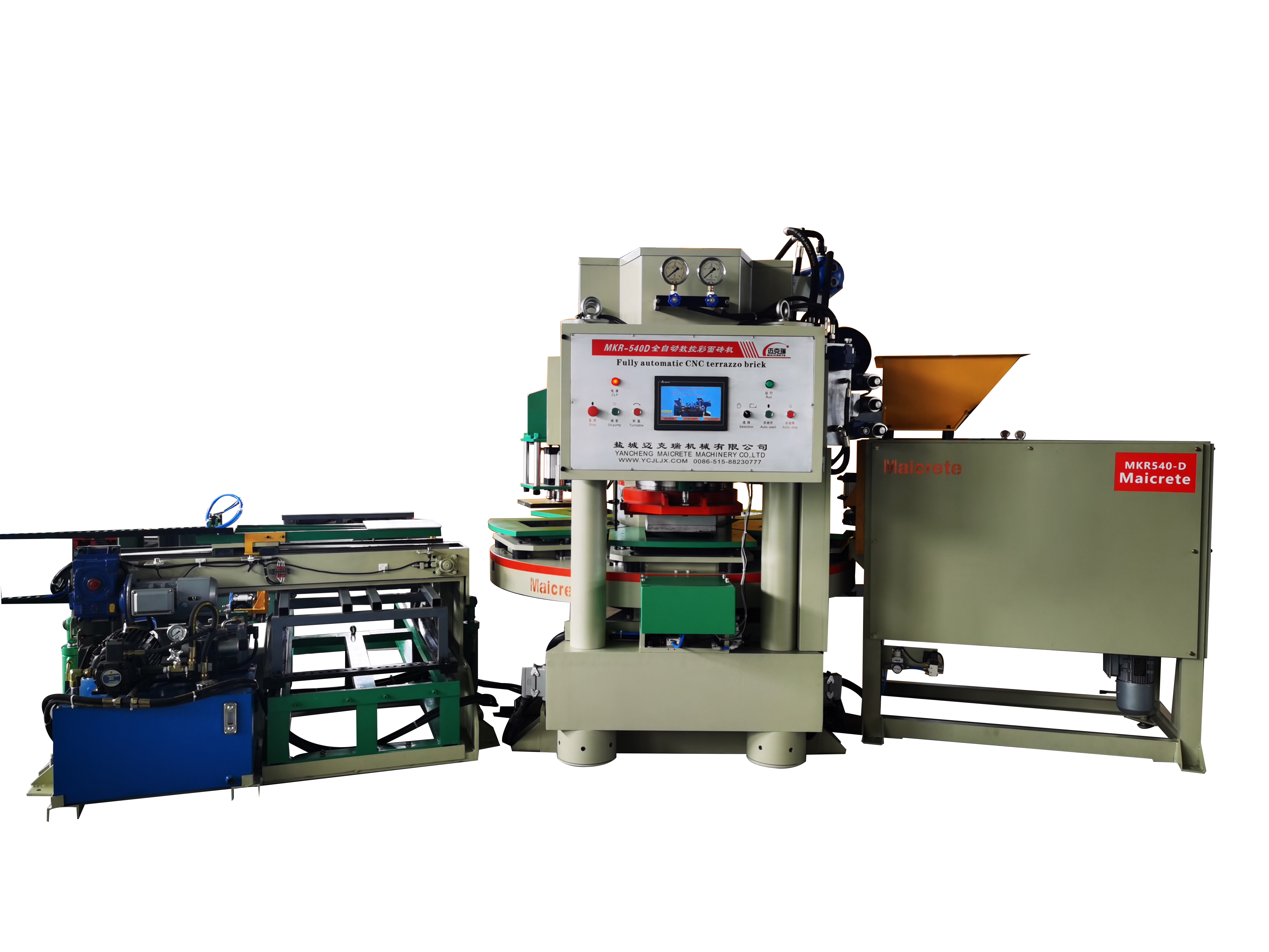 技術參數: 1 、成型塊數:(400×400×40)1塊/模 2、 成型周期:8-16秒 3、成型壓力:3000(KN) 4 、振動頻率:50Hz 5、布料層數:2層 6 、轉盤孔位:5個 7、主機功率:15kW 8 、每小時產量:35-40m2 9、整機重量:8T |